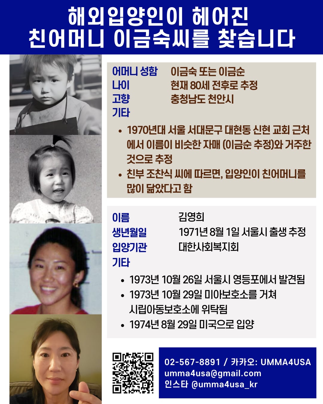 최근 뉴스(https://news.kbs.co.kr/news/pc/view/view.do?ncd=8210820 그리고 https://www.youtube.com/live/h1btAGfSQKI)를 들으셨을 것입니다. 한국 정부가 마침내 수십 년 동안의 비윤리적인 입양 관행을 인정했습니다. 그들은 부모가 있는 아이들을 고아로 위장하기 위해 서류를 위조했습니다. 아이들은 가족에게서 빼앗겼습니다. 저는 1973년 10월 한국 서울에서 잃어버린 어머니를 필사적으로 찾고 있습니다.